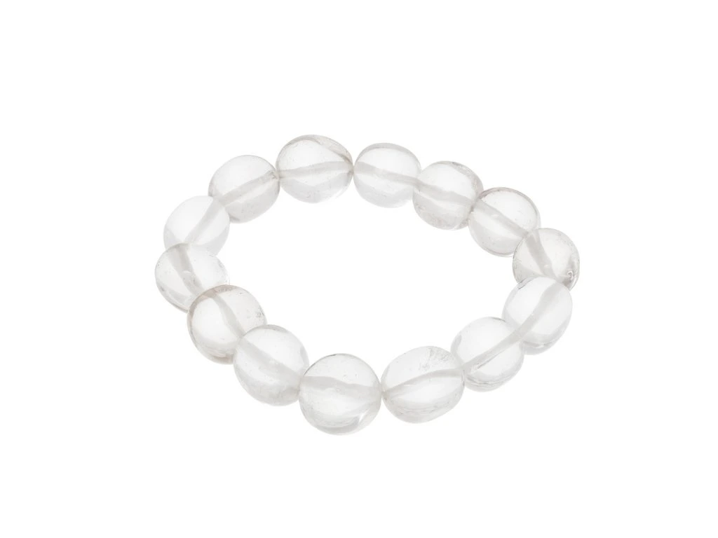 - Náramek je tvořen hladkými, lesklými oblázky přírodního křišťálu, které jsou opracovány do tvaru nepravidelných oválů. Oblázky čiré barvy jsou navléknuty na pružné nylonové niti neutrální barvy.