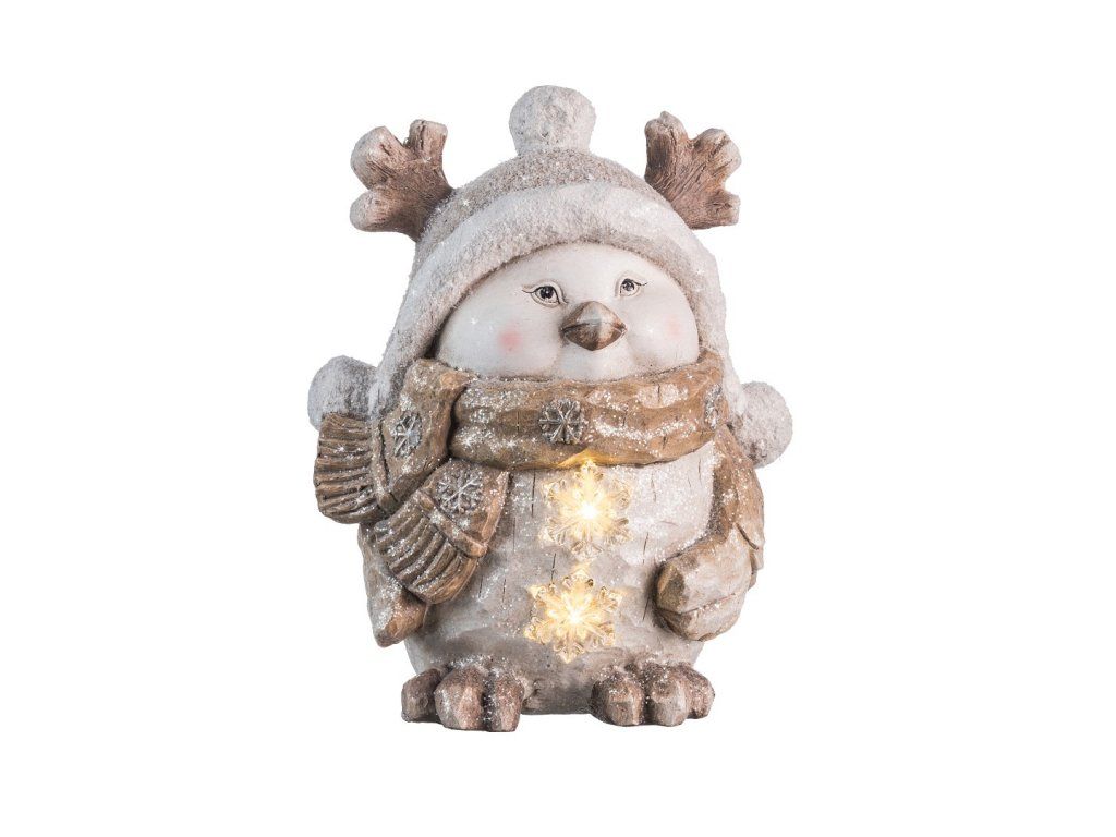 - Roztomilý ptáček v čepici se šálou a svítícími vločkami, jako milá svítící dekorace.